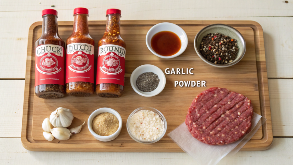 like salt, pepper, garlic powder, and optional flavor enhancers like Worcestershire sauce